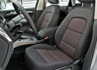 Notranjost Audi Q5 nam je že seznanjena na štirih in Coupe A5. Ergonomija na višini, stoli tkiva z mehanskimi nastavitvami, tesno zadržujejo potnike, in celo košarkarski igralci so dovolj prilagoditve. Na našem testu je obiskal preskusno različico Crossoverja, tako da ne bi čutili čarov osupljivih Bang & Olufsen avdio sistemov, sistem blagovne znamke MMI, tridimenzionalno navigacijo in s trdim diskom, aktivnim tempopodoma in drugim očarljivem življenju. Boljše, v odsotnosti zvoncev, se lahko popolnoma osredotočite na občutke od vedenja avtomobila. Poleg tega je v osnovni različici KU-pete, je opremljena z vsem, kar je potrebno, vključno z elektromehansko parkirno zavoro, tipko za čip, dvo-cone klimatsko napravo, velik centralni monitor in avdio sistem z 8 zvočniki.