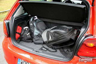 Обемът на багажното отделение е 280 литра. Ако сгънете задния ред на местата, полезното пространство ще се увеличи до 952 литра. За сравнение, MAZDA2, тези показатели са 250/787 литра и Ford Fiesta 295/979. Въпреки това, в багажника поло, намерихме бонус под формата на допълнително отделение под етажа на багажника, но в Русия този бонус ще бъде ангажиран с резервно колело на пълен размер, което за нашата сурова реалност е най-много като бонус бонус.