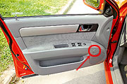 Kulaté tlačítko na horní straně reproduktoru (šipky) se otevře víko kufru
