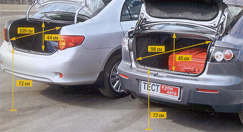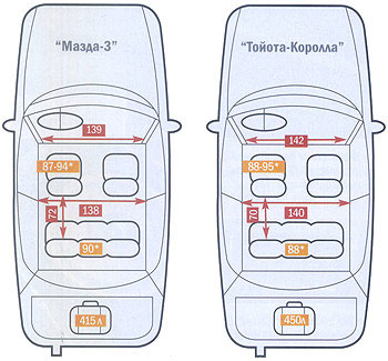 Ale hlavní věc, stejně jako většina sedanů, jsou nákladové schopnosti Toyota omezeny ústavou tří vzoru. Ano, kufr samotných nových Corollů přidal k svazku, Japonci dokonce změnili design zadní odpružení. Ale v reálném životě si nevšimnete 35 litrů výhody oproti Mazdě. Koneckonců, obě auta snadno spolknou dvě velké silniční kufry a ... pouze. Skládání zpět pouze mírně zlepšuje situaci celkového zavazadla narušuje restriktivní oblouk mezi salonem a kufrem. A malá výška neumožňuje oba argumentovat ve skutečné nosné kapacitě se zaměřením, možná nejlepším sedanem ve třídě této disciplíny.