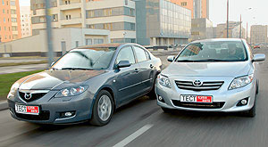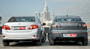 Tato Toyota okamžitě získala přezdívku Mini-Kamri. Stylistická příbuzenství automobilů je zjevně i přes dva kroky třídního schodiště. Pokroky však musí přijímat nejen, ale také ospravedlnit. Je zřejmé, že 10. generace Corolly se nemůže stát bezpodmínečným lídrem v golfové třídě: překonat ruské zaměření svou jedinečnou kombinací ceny a kvality dnes. Proto jsme si u soupeřů Toyota vybrali non -budget Ford, který nebyl stažen z výroby Lancera, který významně nezvýšil cenu na Endru a dokonce ani futuristický Sivik, za který v délce zařadily linky v délce život. Mazda-3 je úplně jiná záležitost. Módní navzdory věku a model byl vyroben již čtvrtý rok, všestranný, ne nejlevnější, velmi populární, toto auto, jak se nám zdá, je ideální u soupeřů Corolly. Navíc nedávno zvětšené kvóty umožnily zkrátit čekací dobu ze šesti měsíců a vyšší na téměř tolerovatelné čtyři až pět měsíců. Mimochodem, soudě podle návrhu, věkový rozdíl mezi konkurenty není pociťován. Podle našeho názoru je Mazda dodnes čerstvá a jasná jako na jaře jeho debutu. Sporné dravé linie obvyklého zdánlivě sedanu vás nezpůsobují, abyste se starali jen o jeden důvod pro třik na našich ulicích rybníka.