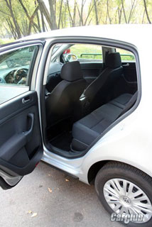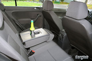 Special Pride Golf Plus - zadní sedadlo. Za prvé, je tam prostorný jak na výšku, tak na šířku i v nohou. Za druhé, je zde loketní opěrka s držáky pohárů, která je v případě potřeby maskována pod místem pro třetího cestujícího, bude se v galerii cítit docela vhodně a úplně.