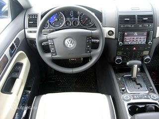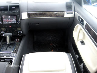 Каюта Touareg 4.2 выполнена от души. Передняя панель прошита кожей, как и другие элементы. Кресла из светлой кожи. Серо-черные мраморные панельки сливаются с темным цветом торпеды, которую украшает телевизор с функцией навигации, радио, телевидения, МП3, ДВД, блютуза. Жалко, что карта не на русском языке. И что антенна для приема ТВ-сигнала работает ужасно (или ее вообще нет?). А вот радио звучит как CD. По примеру Nissan и Infiniti, в этом Туареге поставлена видеокамера вместе с парктроником.