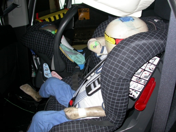 Solo una décima parte de la puntuación se perdió por un automóvil para la protección de un pasajero de 3 años durante los choques frontales y laterales. Sin embargo, con un impacto frontal del sensor en el cofre de un maniquí de 1,5 años, se registró un tirón vertical fuerte. La bolsa de aire del pasajero delantera se puede desactivar, lo que le permite instalar una silla de niños "contra la dirección del movimiento" en su lugar, sin embargo, informar al conductor sobre el estado de la almohada no es lo suficientemente claro. La presencia de una instalación de sillas no se indica correctamente utilizando el sistema de sujetadores ISOFIX en los asientos traseros.Huelga lateral: