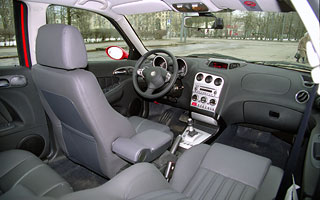 Mientras que en el concesionario de automóviles, escuché a uno de los compradores potenciales que el automóvil era similar a los últimos modelos Mitsubishi. ¡Sosteniendo! Si los automóviles de dos marcas y parientes, esta es la presencia de cuatro ruedas, capucha y parachoques. Lo que no quita la escuela de diseño italiana, por lo que es originalidad y estilo especial, es decir, las cualidades disponibles para todas. La rapidez de las formas, la expresión y el poder, tal combinación en los vehículos en serie de hoy casi no encontrarán. El resto del cuerpo se mantuvo sin cambios. Las mismas manijas elegantes hechas de aluminio mate bajo agarre normal, su ausencia visual desde atrás, relacionando la apariencia de un sedán con un coupé (de hecho, se disfrazan en el panel negro de plástico junto al borde del vidrio). Alimentar un automóvil que cayó a la prueba, decoró el spoiler en el maletero en el techo. Este es el accesorio corporativo de Alfa Romeo, cuyo objetivo es aumentar la fuerza de presión que actúa en el eje trasero y menos cargado a alta velocidad. Que esto sea necesario, sin duda. Bajo la capucha, se instala el 156. Su característica es chispas emparejadas en cada uno de los cuatro cilindros. El doble de encendido significa que por unidad de tiempo se puede quemar con una mayor cantidad de combustible, incurre en su energía. Además, esta solución le permite deshacer el motor a las altas revoluciones. En general, no es sorprendente que su regreso sea de 150 fuerzas. Fue posible lograr las mejores figuras, pero los ingenieros eligieron un compromiso razonable entre el retorno y la carga. El torque máximo del motor alcanza 206 nm. Y, si no es una caja de cambios semiautomática Selespeed, instalada en la máquina de prueba, se sentiría mucho más aguda.