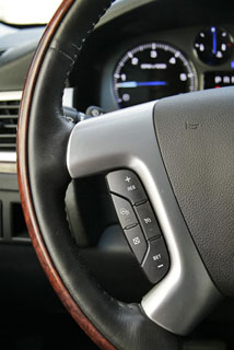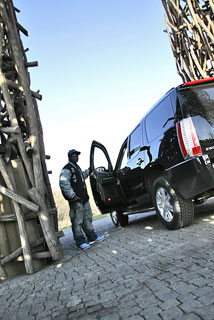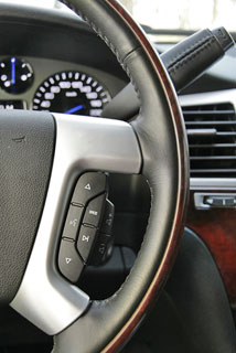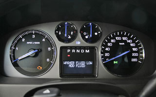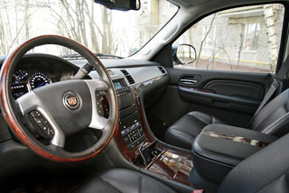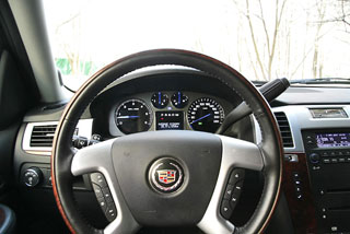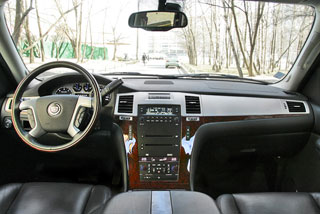 E incluso si solo tiene 2 válvulas por cilindro, está completamente hecho de aluminio, y los pistones livianos y las bielas de conexión le permiten relajarse fácilmente a casi 6000 rpm. ¡Y qué sonido en el fondo es una verdadera América, un salvaje oeste! Por desgracia, con un aumento en las revoluciones, se convierte simplemente en un rugido. Pero el poder de 409 caballos es un buen resultado. Para comparación: en un Boor de 6.0 litros de solo 325 hp. Sin embargo, los especialistas del estudio de ajuste de la corte de AMG en Mercedes-Benz se eliminan más de cien caballos de un volumen similar. La última máquina de 6 velocidades funciona en pares con el motor, que clasifica suavemente y rápidamente a través de la transmisión e incluso tiene un modo de conmutación manual. Pero, ¿cómo se realiza si el selector de ametralladoras se encuentra en la columna de dirección? ¿Aprieto pétalos? No, los ingenieros de GM actuaron de una manera aún más original en un póker masivo de la selección de modos de transmisión, en las inmediaciones del volante, se encaramó una llave de roca pequeña, que sirve para cambiar de marcha. Está claro que será muy raro usarlo con el empuje del motor y siempre tener mucha tracción, y en modo automático la caja funciona muy rápidamente. Pero si quieres mimar, entonces la función siempre está a la mano. A una velocidad máxima de 170 km/h, Escalade sale sin parpadear. La aceleración comienza sin problemas y muy