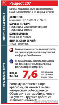traspuesta. Por supuesto, también hay pétalos con los que puedes activar el régimen de control manual. Por desgracia, una pequeña pausa después de elegir una transmisión de puñado ... y el robot vuelve al más alto. ¡Dictador! En nuestra Trinidad, el 207 es el más tranquilo: está bien equilibrado por el ruido y las vibraciones. Al igual que el cachorro de león, incluso en los neumáticos de invierno, mantiene el camino perfectamente y, en su vez, inequívocamente insinúa de ninguna manera un manejo mediocre. En la realidad rusa, sus suspensiones quizás no sean muy cómodas: repiten el perfil de la carretera con demasiado detalle. Pero sorprendentemente, son sorprendentemente sólidos en pequeñas irregularidades y son adecuados para un estilo de conducción activo. En general, ventajas