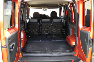 Pero en versiones de bajo costo por encima del compartimiento de guantes hay nichos libres; En la versión más rica, su lugar está ocupado por la bolsa de aire del pasajero delantero. Y solo dos dígitos: 750 litros de compartimento de equipaje, 3,000 litros, pero con asientos traseros plegados. Un automóvil que tiene una versión de pasajeros de carga, que no difiere de DoBlo Panorama, demuestra su principal visera de matadero.