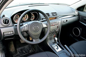 El Mazda-3 actualizado a fines del año pasado no ha cambiado los parachoques, una rejilla de radiador, luces antiniebla, ruedas. En el interior, asientos modernizados, dispositivos blancos de moda. Aislamiento sonoro mejorado; Sin embargo, ella todavía no llevó a Mazda a la posición de campeón sobre la comodidad. Por supuesto, el ruido general disminuyó notablemente, los estímulos más nítidos y desagradables desaparecieron, pero en el contexto de Toyota y Honda impecablemente silenciosos, el automóvil no se ve tranquilo. Esto coincide completamente con el carácter del automóvil. La combinación de un modesto motor de 105 caballos de fuerza con una máquina automática hidromecánica de cuatro velocidades no parece estar sintonizada para un viaje activo. Sin embargo, de hecho, ¡Mazda demuestra cualidades de lucha! La caja de cambios con un régimen manual de moda apenas pertenece a la última generación, pero en combinación con un motor vivo no deja indiferente. Los programas se encienden rápidamente y sin dudarlo, el hidrotransformador multiplica con confianza un par modesto a bajas velocidades, lo que permite que el motor se retire rápidamente, y debido al par principal corto, parece que el automóvil es más potente. La ilusión se disipa cuando intentas mantenerte al día con Honda después de 120 km/h, la ventaja de 35 hp. innegable.