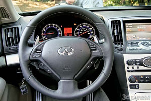 Todos se esfuerzan por convertirse en autos alemanes caros para verse más familiares y mejor para vender. El salón del infinito más pequeño negó mi opinión, mostrando que las tecnologías modernas y las soluciones originales se combinan perfectamente con elementos del estilo nacional japonés. Como los correspondientes no son autos baratos, el volante tiene una regulación eléctrica en dos aviones. Pero aquí la columna se mueve en el plano vertical junto con el panel de instrumentos. Resulta que los dispositivos siempre están en el campo de visión del conductor del volante no los oscurecerán en ninguna condición.
