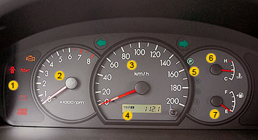 1. Bloque de lámparas de control. 2. Tacómetro. 3. Un velocímetro. 4. Contador de kilometraje. 5. Indicador del modo de funcionamiento de transmisión automática. 6. El indicador de la temperatura del refrigerante. 7. Indicador de nivel de combustible.