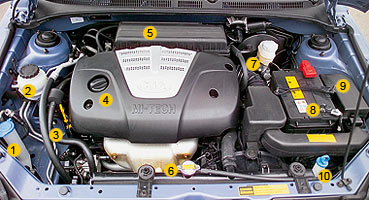 1. Tanque de lavadora de vidrio. 2. Cerrirador del volante. 3. La sonda de aceite del motor. 4. El cuello manchado de aceite del motor. 5. Filtro de aire. 6. Juque de tráfico del radiador. 7. El tanque del cilindro de freno principal. 8. Batería Batería. 9. Bloque de fusibles. 10. Tanque de expansión del sistema de enfriamiento.
