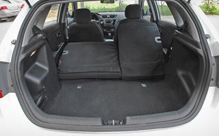 Si antes de eso viajamos juntos, más tres bolsas sudorosas en el maletero, luego en la carretera de Dresde a Varsovia, dos amigos más se han unido a nosotros. Se establecieron bastante cómodamente, a pesar del hecho de que el crecimiento de cualquiera de los pasajeros delanteros no es inferior a 179 centímetros. Desde arriba, dos bolsas más se colocan en el tronco, mientras que ni siquiera tuve que limpiar el estante. Por supuesto, el tronco hatchback durante hasta 111 litros es menor que el tronco del sedán, pero no parece en absoluto. Y teniendo en cuenta la posibilidad de descargar a la cima, él y el sedán se afeitan.