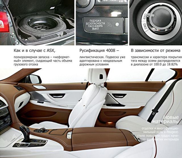 Ya en el interior del marco ya es posible. Y, sin embargo, una máscara de plástico suave en algunos elementos de torpedo, llantas cromadas de instrumentos, una laca negra de moda de la consola central y espectacular, no en detrimento de la comodidad, el nuevo RAM hizo posible dejar una frialdad estilística de la fuente. Por saturación con dispositivos auxiliares, el 4008º no es un campeón del segmento, pero no ascético. En Rusia, un modelo que ofrece en Rusia puede, entre otras cosas, estar equipado con una clave inteligente, una familia (incluidos los controladores para el conductor) por Eyrbegami, control de clima de una sola unión, faros de xenón, asientos con tapicería de cuero, Sistema de audio de alta fidelidad, conectores AUX / USB para conectar dispositivos externos y interfaz móvil Bluetooth. El lujo del navegador integrado en Rusia también está disponible, aunque con la reserva. El navegador electrónico se instalará en el lugar. Muy más rápido, la pregunta se resuelve con la transferencia de tarjetas a la gran, poderosa y, aparentemente, muy compleja. Una computación de bort, por ejemplo, rusificada solo parcialmente: el nombre de la posición es dado por Cirílico, las unidades de medición del latín. Esto no se pudo enfocar en esto si el 70% de la circulación Peugeot 4008 no estaba destinada a países fuera de la UE y en gran medida para Rusia.
