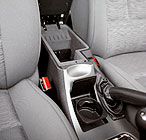 Una caja conveniente para CD y un portavasos plegable cabe en el reposabrazos.