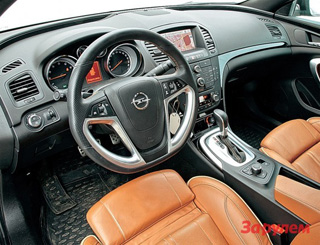 En el interior de la insignia, la buena suerte está adyacente a las molestias fallas. Por ejemplo, una magnífica silla con una gran variedad de movimiento longitudinal es perfectamente adecuado para conductores altos. Pero el volante se superpone a la parte superior del tablero. No todo está bien con la visibilidad: hay un pequeño en el espejo del salón, y los bastidores delanteros anchos aún interfieren en la ciudad. Hermosos espejos son demasiado compactos.