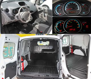Componentes eléctricos Kangoo Z.E. Se combinan de tal manera que el volumen útil del compartimento de carga no ha disminuido en comparación con el talón habitual. La planta de energía se encuentra debajo del capó, la batería debajo del piso en la parte media del cuerpo