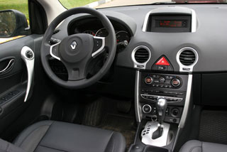 Incluso el cuerpo debilitado por la gripe puede controlar los Koleos: la fuerza en el volante y los pedales es mínimo, y gracias al variador, el conjunto de velocidad se proporciona de manera fácil y rápida. Las vibraciones de la carretera y las ruedas delanteras prácticamente no se transmiten al volante.