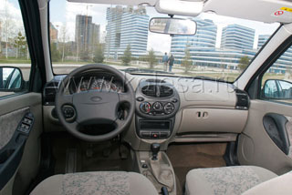 Pero no hay tal negligencia en otro plan: por primera vez, Kalina está disponible con dos bolsas de aire frontales. Aquí están solos integrados en el panel sobre el compartimiento de la guantera, el segundo se recuerda a sí mismo que se ha convertido en una parte central de la volante. También hay pretensores de cinturones, sin ellos, EIRBEG ya no se pone. El principal cambio visible en la consola delantera, el botón de control de configuración del clima. Es cierto, durante nuestro viaje, una característica revelada a este último: podría mantener una temperatura dada al menos 22 grados. Valió la pena ganar menos y el sistema se convirtió en un acondicionador de aire ordinario, congelando a todos los habitantes de la cabina.