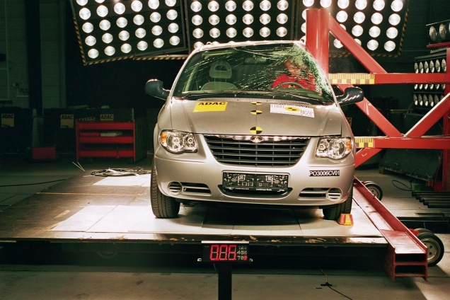 Dans un premier temps, EURO NCAP a testé des échantillons avec le volant à droite. Par la suite, on a appris que les voitures gauchers ne sont pas équipés d'un coussin de sécurité pour les genoux du conducteur, bien qu'il entre dans la configuration de base pour la conduite à droite (en commençant par VIN 6Y110573). En fait, une telle option est disponible pour les versions avec le volant à gauche. Depuis la version de référence ne sont pas conformes aux exigences de qualification de l'Euro NCAP, il était nécessaire d'effectuer un test supplémentaire avec le gaucher, dont les résultats ont été adoptés pour déterminer l'évaluation globale. La voiture conduite à droite avec un choc frontal se manifeste nettement mieux que le gaucher, gagnant 9 points et promettant quatre étoiles potentiels dans la catégorie de la protection des passagers adultes. La base d'une telle évaluation a été la moindre déformation de l'habitacle. Dans la voiture, avec la croix-emplacement du moteur, potentiellement moins d'espace pour absorber l'énergie de la grève de l'autre côté où le moteur est situé. Sans mesures supplémentaires pertinentes, elle peut conduire à une plus grande déformation de l'habitacle. Dans Voyager, le moteur est situé sur le côté droit du compartiment moteur. Pour Euro NCAP est la pratique habituelle de demander une confirmation du même niveau de sécurité des versions à la main droite et à gauche de la voiture. Dans ce cas, Chrysler n'a pas fourni ces informations. Le fabricant a conseillé de tester une voiture à la vitesse requise par la législation européenne, ce qui est inférieur à celui de la méthode EURO NCAP. Les spécialistes de cette organisation exigent des producteurs du même niveau de sécurité des voitures avec le placement à droite et à gauche des organes de direction. Bien que la copie droitière était équipé d'un coussin de sécurité pour les genoux du conducteur, il n'a pas donné un bon résultat avec un choc frontal.Punch avant: