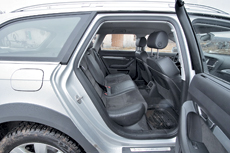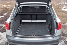 Regardons maintenant à l'intérieur, et nous allons d'abord ouvrir le coffre. Non, non, ne vous précipitez pas pour vous salir les mains sur la poignée de la porte arrière! Il suffit d'appuyer sur le bouton de la touche FOB (c'est aussi la touche d'allumage), et la porte s'ouvrira automatiquement à l'aide du lecteur électrique. Le coffre est inférieur au volume des représentants les plus spacieux de la classe Oktavia et XC 70, mais son espace utile est suffisant pour s'adapter à la famille d'une famille de trois ou quatre personnes se rassemblant lors d'un voyage dans une station de ski. De plus, la possibilité de transformation du salon est très bonne: les sièges arrière sont pliés dans une proportion 2: 1, cependant, ils ne forment pas un plancher complètement uniforme; Il y a une trappe pour les skis longs à longue race, et une barre de retenue, se déplaçant dans des rainures longitudinales sur toute la longueur du compartiment de chargement, ne permettra pas aux valises de voler à travers le tronc. Il y a aussi un support de bande pour une cartouche avec non-déège, et dans le sol un organisateur de bagatelles, a sa propre niche et un quai, il est donc garanti de rester propre, de sorte que le remplacement de la roue percée deviendra plus à l'aise. De plus, vous pouvez séparer le compartiment à bagages du compartiment de passagers avec un rideau de naufrage translucide.