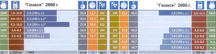 Jusqu'en 2004, Galaxy a été vendu avec quatre moteurs. Cependant, récemment, il n'a pu être acheté qu'avec un moteur à essence de 2,3 litres (145 ch). L'alternative actuelle est une voiture de 2 litres de la même capacité. En raison de la masse plus petite et du design moderne, une telle fourgonnette est plus rapide accélère à des centaines, plus économiquement à des vitesses de banlieue, bien qu'elle ait légèrement perdu en traction.