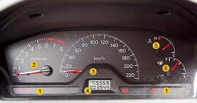 1. Bloc de lampes de commande. 2. Tachymètre. 3. Un compteur de vitesse. 4. COMPRESSION DE MALIAGE. 5. L'indicateur de la température du liquide de refroidissement. 6. Indicateur de niveau de carburant.