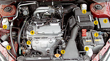 1. réservoir de lave-glace en verre. 2. pétrolier du volant. 3. La sonde d'huile du moteur. 4. Le cou mis à l'huile du moteur. 5. Le réservoir du cylindre de frein principal. 6. Bloc de fusibles. 7. Batterie Batterie. 8. Réservoir d'expansion du système de refroidissement. 9. Bouc-circulation du radiateur.