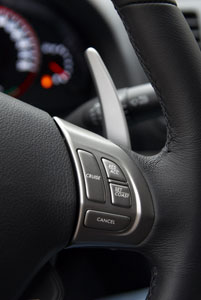 Il y a plus de changements à l'intérieur. Les concepteurs ont abandonné la Subaru des dernières années de la console centrale d'argent. Il est maintenant noir, et sur les affaires des derniers jours, ils ressemblent à des côtes coupées pour le métal. Sur le tunnel entre les chaises à côté de l'anneau d'argent recouvert du sélecteur de transmission automatique se trouve un joli contrôle de la rondelle du système SI-Drive. Derrière elle, deux porteurs de tasse qui sont spectaculaires illuminés dans l'obscurité. La qualité de l'assemblage est en hauteur, les matériaux de finition sont solides. Il est seulement dommage qu'il n'y ait pas de moniteur de couleur au centre du panneau avant, au lieu d'une niche pour les bagatelles avec un couvercle. Derrière le volant à trois rayons, les commandes de la commande de la boîte de vitesses automatique se cachent. Ils sont fixes immobiles sur le moyeu, cependant, la staticité est compensée par la taille du point supérieur vers le bas de près de 10 cm. Le volant lui-même est multifonctionnel, avec son aide, vous pouvez être contrôlé avec un régulateur de vitesse, un système musical et un menu d'un ordinateur embarqué. Les chaises sont légèrement profilées, le corps est assez bien fixé.