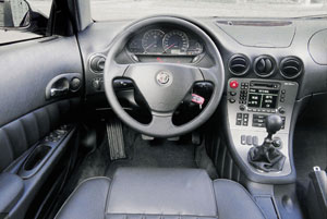 დაფა ტრადიციულად მზადდება: ქრომის რგოლებით ჩარჩოების მოწყობილობები ერთ ბლოკში იკრიბებიან, მათ შორის ტემპერატურის ინდიკატორები და საწვავის დონე, რომლებიც ტორპედოს ცენტრში გადაიტანეს 156 -ე ადგილზე. გაერთიანების მკაფიო ნიშანია სავენტილაციო სისტემის მრგვალი დეფლექტორები, რომლებიც მსგავსია ჟილეტებით, ისინი პირველად გამოჩნდნენ 33 -ე ALFA- ში და ახლა გამოიყენება Alfa Romeo- ს ყველა მოდელზე, ფიატის ზოგიერთ მოდელზე და თუნდაც Maserati 3200 GT. ქრომის რგოლები მშვენიერია, მაგრამ გვერდითი ჭიქაში აისახება სარკეების ფონზე, რაც გარკვეულწილად ერევა. ცენტრალური პანელი მორთულია ლითონის პლასტმასით. Focus არის დიდი მრავალფუნქციური ეკრანი, რომელიც აჩვენებს ინფორმაციას სავენტილაციო სისტემის, სანავიგაციო სისტემის (ასეთის არსებობის შემთხვევაში) და აუდიო ინსტალაციების შესახებ. Auto -avo -Aviations– ის კარგად ცნობილი იტალიელი მწარმოებელი -Momo, რომელსაც საყრდენი ემბლემა ჰქონდა, ინტერიერის დეკორაციას მიმაგრებული ჰქონდა.