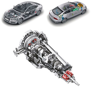 ოთხი საწოლიანი გრანტის ტურიზმის ტრანსმისიები ორჯერ სთავაზობენ. წინა წამყვანი და ყველა წამყვანი quattro. ტრადიციული torsen მალე დარტყმა ფრენა. Audi იღებს განაკვეთები დიფერენციალური ხახუნის გვირგვინი დიფერენციალური ახალი დიზაინი გვირგვინი Gears და ხახუნის მრავალრიცხოვანი დისკი საკეტი დაწყვილება. ეს diff დებიუტი სრული დისკზე სისტემა ბრალი RS5, და ახლა გადავიდა A7. ახალი დიფერენცირებული ცვლილებებს შორის thrust შორის წინა და უკანა ბორბლები ფართო ლიმიტები, ვიდრე torsen. ჩვეულებრივ, კვანძი განლაგებულია 40: 60-ის პროპორციით უკანა ბორბლების სასარგებლოდ. როდესაც slipping, მას შეუძლია გადასცეს 80% ბრუნვის უკან ან მდე 75% წინ.