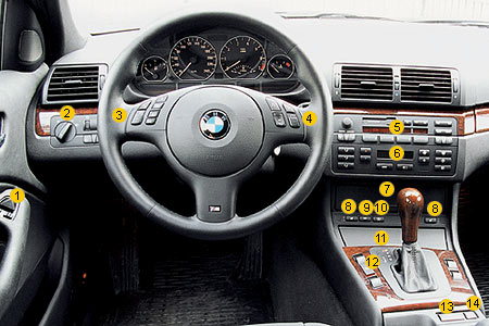 1. სარკის პარამეტრების დისტანციური მართვის. 2. ცენტრალური შუქის შეცვლა, მოწყობილობების განათების სიკაშკაშის რეგულატორი და ნისლის თავების და ნათურების კონცენტრატორები. 3. აუდიო სისტემის და ტელეფონის მართვის პანელი. 4. საკრუიზო კონტროლის პანელი. 5. რადიო. 6. კლიმატის კონტროლის დისტანციური მართვა. 7. კრივი პატარა ნივთებისთვის. 8. კონცენტრატორები. 9. დინამიური სტაბილიზაციის სისტემის შეცვლა. 10. ფარდის ელექტრული დრაივის შეცვლა. 11. ნაცარი. 12. ფანჯრის ღილაკები. 13. განგაშის შეცვლა. 14. ცენტრალური მსახიობის ღილაკი.