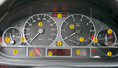 1. საწვავის დონის მაჩვენებელი. 2. ღილაკი ყოველდღიური გაშვების ნულისთვის. 3. სიჩქარე. 4. დინამიური სტაბილიზაციის სისტემის სასიგნალო მოწყობილობა. 5. საკონტროლო ნათურების ბლოკი. 6. ტაქომეტრი. 7. ეკონომიკა. 8. დროის ინდიკატორების შეცვლა/ჯდომის ტემპერატურა/მომსახურების ინტერვალი. 9. გამაგრილებლის ტემპერატურის მაჩვენებელი. 10. ავტომატური გადაცემის სელექტორის ინდიკატორი. 11. საათის/გარბენის მრიცხველი/ეკრანიანი კომპიუტერის ეკრანი. 12. უწმინდური კარების სასიგნალო მოწყობილობა.