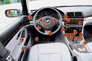 10. ტყავის საჭე, იგივე, რაც M5 მოდელზე, ქვედა ნაწილში აქვს დამახასიათებელი ტრიკოლური ემბლემა. 11. საჭის კერაში - წინა ბალიში. 12. პლატფორმა მარცხენა ფეხი. 13. მართვის პანელი მეხსიერებით სამი კორექტირებისთვის (საჭე+სავარძელი+სარკეები). 14. Windows Control პანელი და გარე სარკეების კორექტირება.