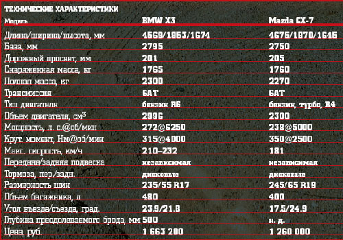 შედარება ტესტი მონაწილეები არ შეგრძნებები და ფული, მაგრამ ტექნიკური სპეციფიკაციების შესაბამისად, აღმოვაჩენთ, რომ ძალა X3 34 ლ. ერთად. სხვა. მაგრამ CX-7 35 nm მეტი ბრუნვის, და ეს არის გაცილებით დაბალია რევოლუციები. მაგრამ BMW არის სწრაფად 1.1 წამში აჩქარება 100 კმ / სთ. ამავე დროს, ქალაქის და Mazda მაგისტრალზე 30 ლ და 1.6 ლიტრი, შესაბამისად. სხვათა შორის, შედარებითი საწვავის ერთი skates of BMW. თუმცა, ყველა ეს მხოლოდ ქაღალდი და მელნის მოღვაწეები, kilobytes და პიქსელი. Life საუბრობს სხვა ენაზე.