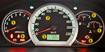 1. Tachometer. 2. Speedometer. 3. გაუშვით მეტრზე. 4. საწვავის დონის მაჩვენებელი. 5. გამაგრილებლის ტემპერატურა მაჩვენებელი. 6. Blocks კონტროლის ნათურები.