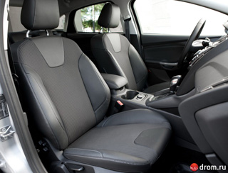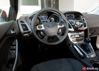 წინა პანელის დიზაინი წარმატებული იყო. ის წინ მიიწევს და თითქოს მძღოლის ადგილის გარშემო ტრიალებს, რაც ქმნის მსგავსებას იმ გრძნობის შეგრძნებას, რომელიც საჭესთან იჯდა კაბინეტში. მახსოვს, სანამ BMW მანქანები განთქმული იყო ამ მიდგომით. ახლა კი Ford Focus. წინა პანელი გატეხილია, ის ზარბაზებს სახეების კონიუგაციას, და სასიამოვნოა შეხებით, ეს ყველაფერი დამზადებულია ელასტიური პლასტმასისგან. ხელების შეხება სიამოვნებაა. და სხვა დეკორაციის მასალები კარგია. ზედა ნაწილში კარების პანელები ასევე რბილია (თუმცა, რადგან შესაძლებელი გახდა მოგვიანებით გაირკვეს, რომ არა ყველა მორთულობის დონეზე, იაფზე ძნელია). ცენტრალური კონსოლი დასრულებულია შეღებილი ვერცხლის პლასტმასით, რომელიც არ გამოიყურება იაფი. ვიზორის ქვეშ, ნაპოვნია ფერის ჩვენება, რომელზედაც ნაჩვენებია მანქანის გარკვეული ფუნქციების კონტროლი. ეკრანის ქვეშ არის შავი Spineol ბლოკი, იგი ეხმიანება დიზაინით წინა ფოკუსით, ისევე როგორც ცალკეული კლიმატის კონტროლის კონტროლი.