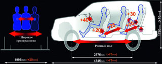 ეს დიაგრამა ნათლად აჩვენებს, თუ როგორ გაიზარდა ახალი მფრინავი ზომით და ამის გამო შესაძლებელი გახდა მანქანის შიდა სივრცის გაზრდა.