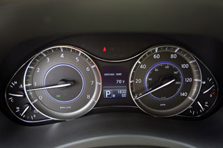 Infiniti Designers წავიდა შემდგომი და დააგდეს ყველა მძიმე პლასტმასის სალონი, შეცვალა იგი სიმრავლის კანის და სხვა სასიამოვნო მასალების შეხება. ცენტრალური კონსოლი დასრულდა იგივე რბილი კანით, როგორც სავარძლები, იგივე ბრწყინვალე firmware. საკონტროლო ღილაკებს შორის არის აშკარად ეგზოტიკური წარმოშობის ნიმუში, რომელიც ხელს უწყობს ქრომის აქცენტებს ყველაზე სწორი ადგილებში. წინა პანელზე არაფერია შოკისმომგვრელი ან შეუსაბამო, ყველაფერი ძალიან ერგონომიულად და ძალიან ნათელია.