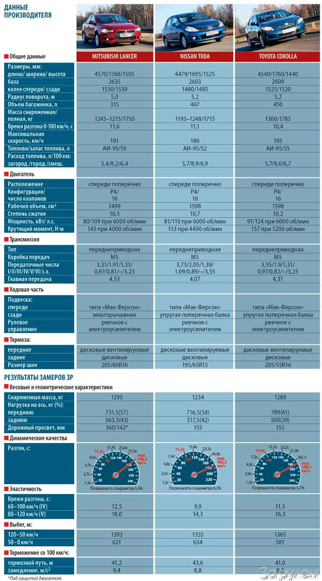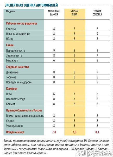 In ლიდერი Corolla და აკუსტიკური კომფორტს. მან არ დააჭიროთ ხმა დამთავრების სისტემა, როგორიცაა Lancer; მისი საავტომობილო მღერის მაღალ სიჩქარეებზე quieter ვიდრე tidida; აეროდინამიკა ასევე უკეთესია, ვიდრე კონკურენტები. მაგრამ არსებობს სუსტი მხარეები. დისკები სწრაფად რეაგირებს უხეშ საფარი, შევსების სალონი ხმამაღლა შველი. ისინი უნდა დასვა გზიდან ყოველ კენჭის, ქვიშის და ძალაუფლება ლითონის. გამოიწერეთ ღირს, რომ თქვენ დაიწყოს უჩივიან მიუღებელია გზები, მაგრამ თქვენ გადატანა სხვა მანქანა - ასფალტის თუ იყო მთვრალი!