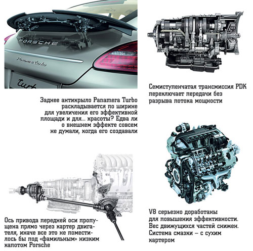 ორივე ძრავები აღჭურვილია პირდაპირი საინექციო სისტემებით და ფაზის ცვლილებით და სიმაღლის მოხსნას. შვიდი ნაბიჯი გადაცემათა კოლოფი ორი clutches სტანდარტული გადაცემის Panamera Turbo და 4s, ვარიანტი S. სრული Drive სისტემა მუშაობს იმავე პრინციპზე, როგორც Porsche Sports Machine: მუდმივი დისკზე უკანა ღერძი და დანამატი MultiDiskisk დაწყვილება წინა. წინა-საბოლოო შეჩერება წინასაარჩევნო და მრავალ ზომებში აღჭურვილია აქტიური შასის ყველა ატრიბუტებით, რომელიც ხელმისაწვდომია კომპანიის განკარგულებაში: ახალი კლირენსის ცვლილების სისტემა, აქტიური პაზმის შოკი შსს-ს აბსორბერები და აქტიური PDCC განივი სტაბილურობის სტაბილიზატორები. ტრადიციულად ხელმისაწვდომი და მუხრუჭები კომპოზიციური კერამიკული დისკებით. ისინი უფრო ეფექტური, გრძელვადიანი და წონა ნაკლებად ტრადიციული ფოლადი.