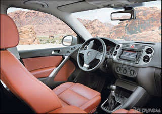 სალონი ზუსტად ისეთია, როგორც გოლფის პლუს სადგურის ვაგონი, უკანა სავარძლების გადასატანად, განცალკევებულია 60:40 პროპორციით, მაგისტრალის ცრუ იატაკით და მხიარული წინა პანელის რვა (!) ვენტილაციის დეფლექტორით. თუ კარების პანელები არ არიან აღმავალი სახელურით და უზარმაზარი ჯიბით. მაგრამ საბორტო ელექტრონიკის ნაკრები უფრო საინტერესოა. პირველ რიგში, Tiguan, ისევე როგორც განახლებული Touran, აღჭურვილია პარკირების ასისტენტთან ერთად, რომელიც, სენსორების წაკითხვის თანახმად, დამოუკიდებლად ბრუნავს საჭე. მეორეც, მოწინავე მულტიმედიური სისტემა მაღალი რეზოლუციის სენსორული ეკრანით (800x480 ქულა) და ყველა სახის გარე ინტერფეისი, 30 გბ-ის მაღალი დონის პალატის მყარი დისკი. და სანავიგაციო სისტემის ძირითადი მიღწევა, რომელსაც შეუძლია დაიმახსოვროს ბილიკი იმ ადგილებში, რომლებიც არ არის რუკაზე. მინიშნება უდაბნოების და სტეპების გავლით?