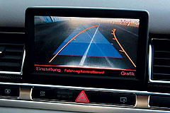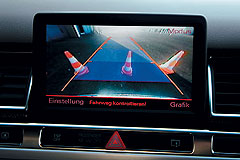 В ходе развлечений на полигоне организаторы тест-драйва предложили проехать задним ходом по размеченной трассе. Pentru ce? Проверить наши навыки, прежде чем пускать в свободный тур по стране? Трогаемся и сразу понимаем, зачем: на дисплее возникает картинка заднего вида, на которой двумя желтыми линиями строится прогнозируемая (в зависимости от поворота руля и скорости) траектория движения. Езда задним ходом превращается в компьютерную игру, где ваша задача сводится к совмещению желтых направляющих с изображением дороги. На всякий случай, правда, парктроник тоже имеется.