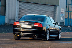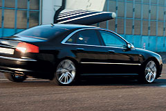 На импровизированном полигоне (аэродроме) расставлены конусы: змейка, разворот, полоса торможения. Тут уже отличие от А8 становится более заметным. Меньшие крены в поворотах, очень эффективное торможение, ну и, конечно, совсем другая динамика разгона. В целом автомобиль своей устойчивостью и цепкостью вселяет чувство уверенности, предлагая тем самым более резкую (для кого-то -- более спортивную) езду. Ну, так он для этого и сделан. Потенциальную мощь и динамику двигателя особенно остро ощущаешь, выключив систему динамической стабилизации ESP: машина легко срывает в занос все четыре колеса на абсолютно сухом асфальте от любого неосторожного нажатия газа.