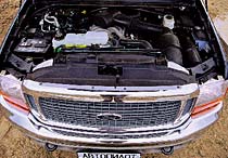 Kung Limited. Designul acestui monstru este simplu ca rake de grădină: cadru purtător al unui tip de scară, suspensie de primăvară, poduri continue. Deci, ar trebui să fie la baza designului excursiei - un camion Ford F-250, care înlocuiește americanii Zil-130. Suntem instalați pe Zil Kung cu o sobă autonomă pe motorină și atârnă un semn de oameni. Americanii au instalat pe vagonul de corp normal Ford F-250 cu scaune din piele și toate prăjiturile și atașate un semn modest limitat. Sub toate prăjiturile, înțeleg instalația climatică cu consolele descurajate pe tot salonul, înregistratorul de bandă radio cu un schimbător de CD pe 6 discuri, reglabil pentru toate planurile de geometrie cunoscute și schimbarea cursei pedalei. Magnetol cu \u200b\u200bschimbător de CD-uri și acustică frumoasă (am notat absența RDS este un cip tipic american). Dar pentru pasagerii din spate există un cuib pentru căști. Există toate semnele unui sedan reprezentativ, doar asamblate pe camionul șasiu. În acest sens, există câteva întrebări producătorului. De exemplu, deoarece nu se tem să sări peste aparatul de aer condiționat sub tavan, condensul va începe să ascuți metalul acoperișului după un an?