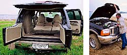 Aceasta nu este Africa. Da, aceasta este America. Ford Excursion este același ca un simbol al SUA, ca un mestecător, hamburger cu colesterol și BBW în șosete și adidași albi. Este surprinzător de combinat cu cele mai recente realizări ale industriei automobilelor și a structurii patriarhale, bătrânul Henry Ford. Pe de o parte, volanul cu amortizor, ABS, roți ventilate în față și spate, senzori de parcare și control de croazieră. Pe de altă parte, transmisia automată Kocherga tradițională, compas în centrul calculatorului de la bord, numărul fenomenal de golire sub orice container cu lichid și destul de ieftin din plastic în decorarea interioară. Se pare că panoul frontal își trăiește în general propria viață atunci când excursia trece peste câmpul rusesc arat în perioada programului alimentar domnul Gorbaciov. Iată un alt lucru tipic american. Mânerul Jack și cheia balonului sunt situate sub capotă, aproape pe radiator (că sunt, într-un loc de loc
