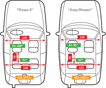 De aceea, în ciuda faptului că șase din punct de vedere matematic este mai puțin compatibil, este inferior Fordului din margine, capete și lățimea canapelei este reală în Mazda, cu un confort complet va fi același cuplu înalt sub 1 m 85 cm. Și asta, notăm, când condițiile aceleași sănătoase stoarce frontul.