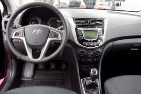 Scaunul din spate este spațios în lățime, iar pentru genunchii pasagerilor sunt lăsați decent. Numai oamenii înalți sunt mai buni în Solaris pentru a sta în față: numai oamenii cresc sub media pot îndrepta și nu răni capul tavanului.