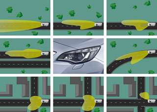 Sistemul, observând obiecte și mașini care stau pe marginea drumului, trage concluzii despre mediul în care se află mașina. De exemplu, în oraș cu viteză mică, un pachet ușor este mai larg și lovește în apropiere. Luminozitatea este ușor redusă pentru a nu orbi din nou șoferi. Pe piste cu viteză mare, intervalul crește proporțional cu creșterea vitezei, unghiul de vizualizare, forma punctului de lumină și înclinarea pachetului se pot schimba, de asemenea, semnificativ în funcție de situație