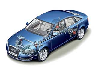 Audi-A6 Chorvátro Klasický pohon všetkých kolies s medzidózovým diferenciálom zvýšeného trenia Torsen a asymetrického